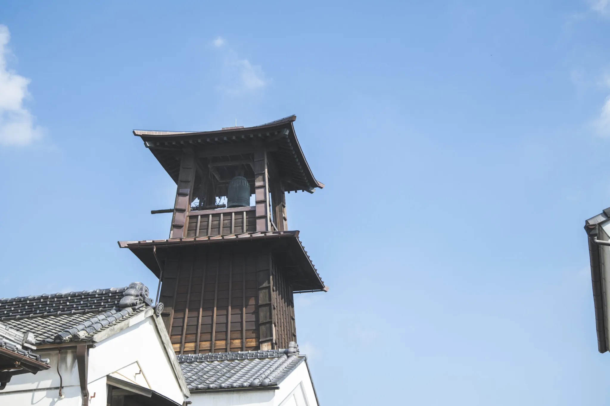 度重なる火災で現在は4代目。 響きが良い鐘の音は平成8年、環境省の「残したい“日本の音風景100選”」に認定されました。 木造3層のやぐらは高さは約16メートル。 午前6時・正午・午後3時・午後6時の1日4回鐘が鳴らされます。