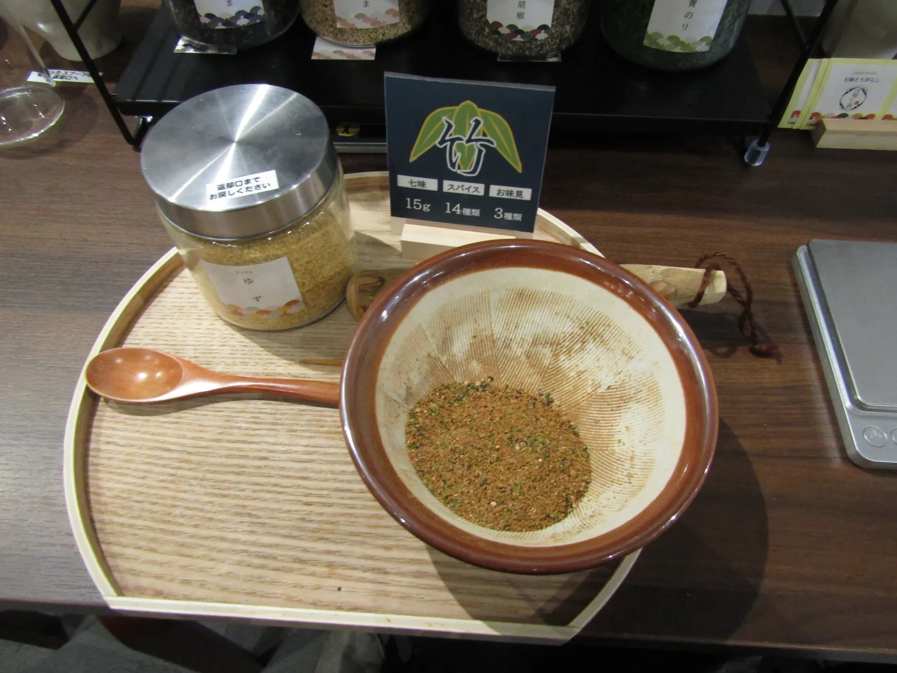 好みのスパイス(柚子・唐辛子(甘口)・唐辛子(辛口)・山椒・陳皮・白ごま・黒ごま・青のり・黒胡椒・生姜・にんにく・わさび・焦がし醤油・魚粉から)選んで混ぜ合わせて袋に詰めます。出来上がりはその場で温泉たまごやみそ田楽に付けて試食ができます!