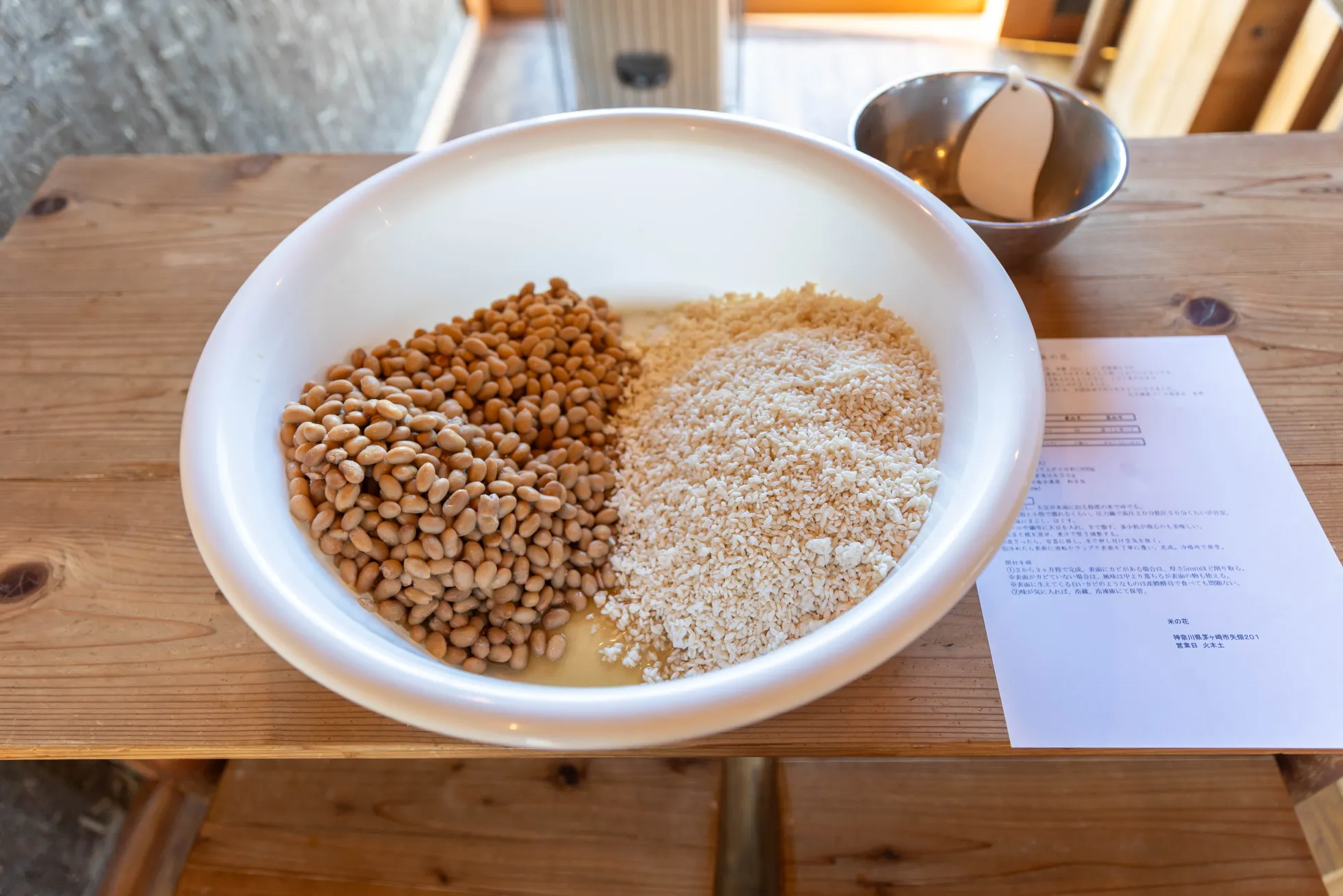 明るく居心地の良い店内で味噌づくり。持ち帰った後は味噌の成熟を見守る楽しさもあります。