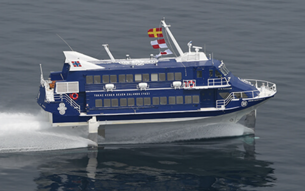 2002年から新たに、時速80kmものスピードを誇る「ジェットフォイル」(通称「ジェット船」)が就航。 ※デッキ正面に、大島発のジェット船が12時25分に到着するので要チェック。 アメリカの航空機メーカーが開発した船で、ジェットエンジンで海水を吹き出し、海水から揚力(浮き上がる力)を得て飛ぶ「海のジェット機」です。 浮き上がって航行するため、船体への海水の抵抗が少なくなり、時速約80kmのスピードを実現。しかも波の影響を受けず、ほとんど揺れないそうです。 竹芝から大島まで大型客船(夜行)だと最短6時間のところ、ジェット船だと最短1時間45分。 知らないうちに、ずいぶん便利になっています。