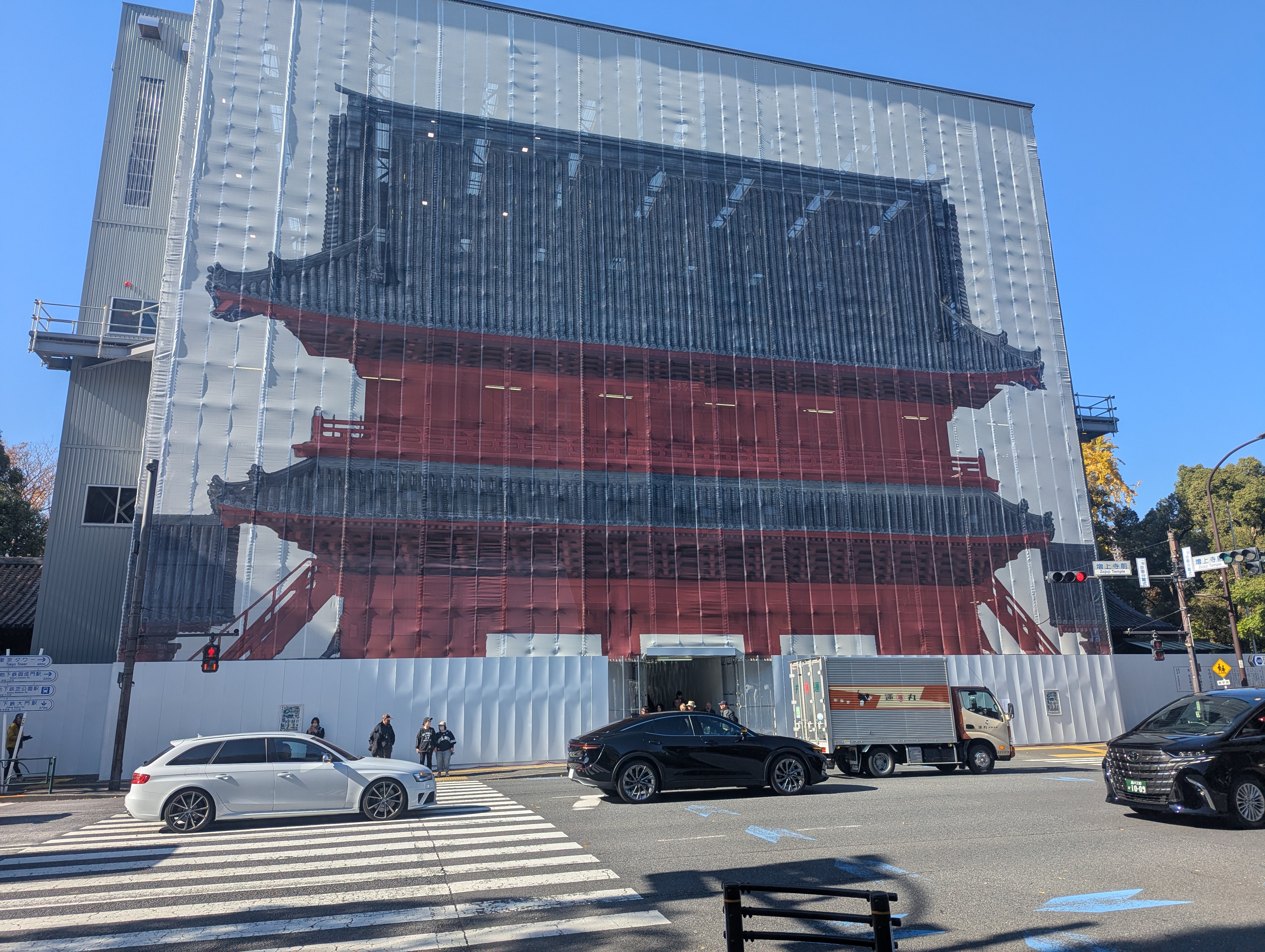 景色を楽しんだ後は増上寺へ。 東京・芝公園にある増上寺は、600年以上の歴史を持つ浄土宗の大本山です。徳川家の菩提寺として発展し、江戸時代には日本有数の大寺院となりました。現在も東京タワーを背景にした美しい風景とともに、多くの参拝者を迎えています。 まずは入り口にそびえる「三解脱門」です。1622年に再建されたこの門は、度重なる戦災を免れた貴重な重要文化財であり、この門をくぐることで三つの煩悩から解き放たれると言い伝えられています。 現在は改修工事中です。