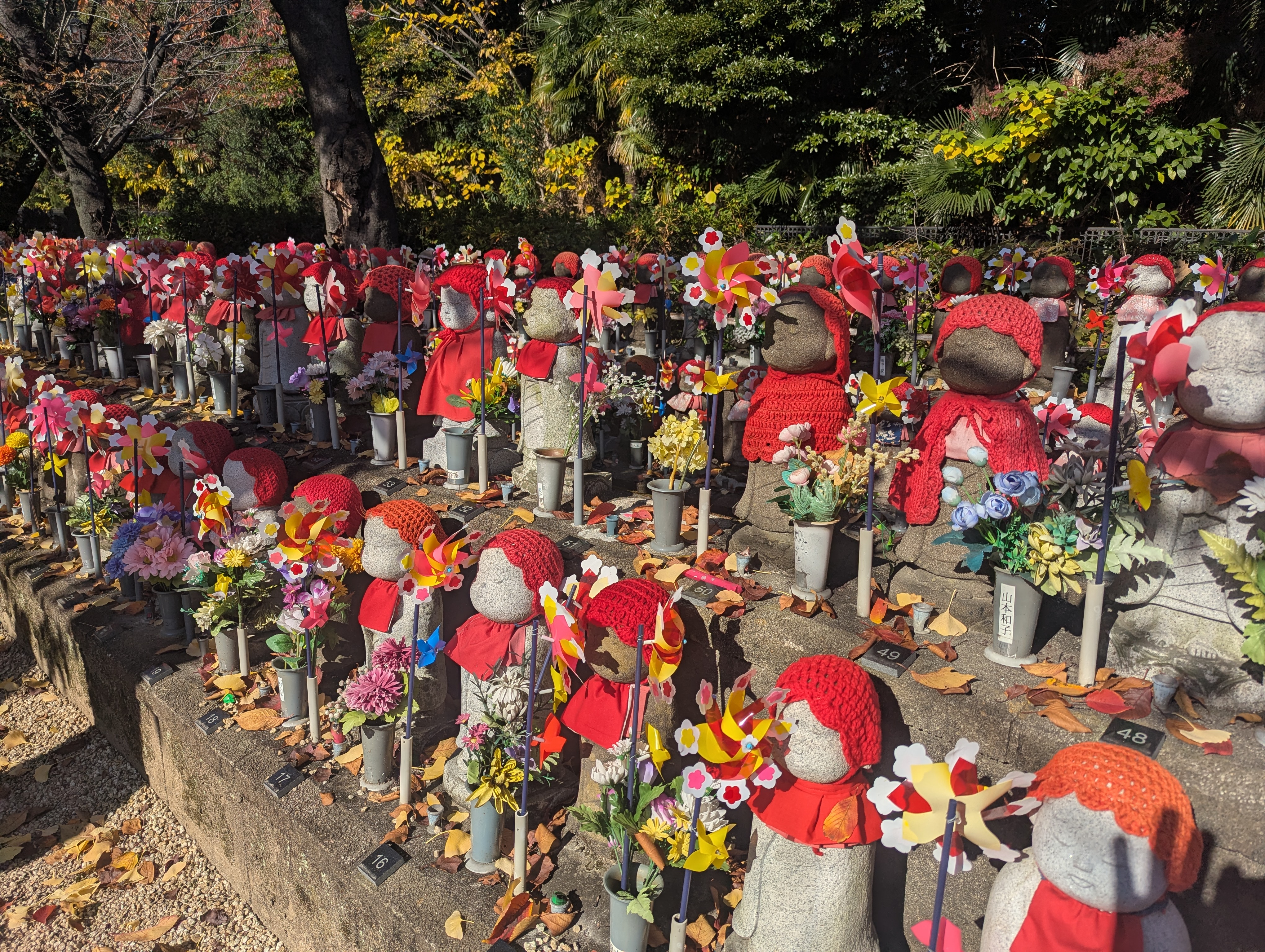 一方、「大殿」の右手には、「赤い帽子」「赤い前掛け」「風車」を奉納された「千躰子育地蔵菩薩」が並びます。豪徳寺の招き猫もいいが、ここのお地蔵さんもかわいい。