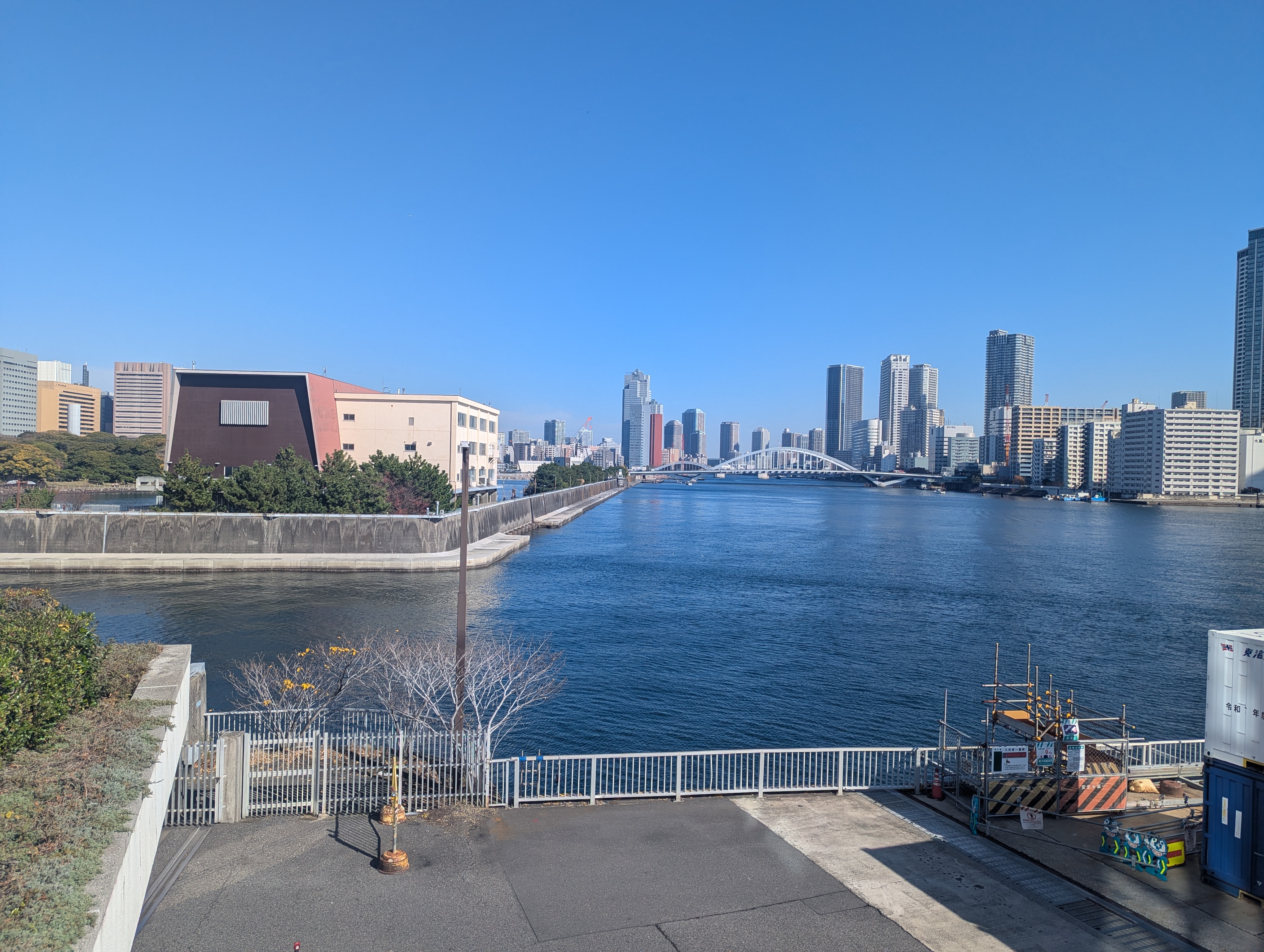 まず向かうのは竹芝客船ターミナルの上階にある竹芝デッキ。 デッキ左手の眺め。高層ビル・マンションは増えましたが、隅田川に架かる勝鬨橋と川の左の浜離宮は昔と変わらない、水の都・東京を感じさせる眺望です。