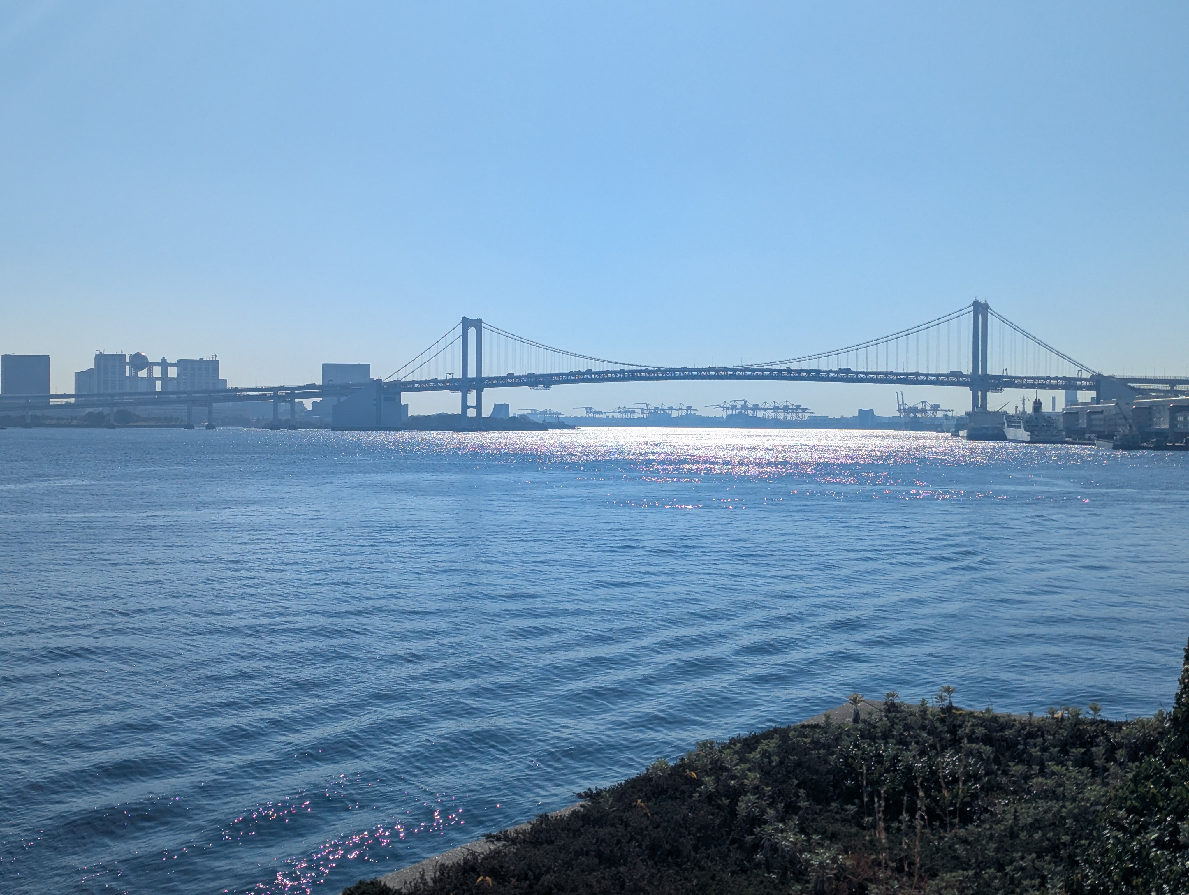 デッキ右手の眺め。 東京湾とレインボーブリッジ、橋の左にはフジテレビ本社ビルなどお台場の街が望めます。レインボーブリッジは1993年開通、フジテレビ本社ビルは1996年竣工。昔にはなかった新しい眺めになります。