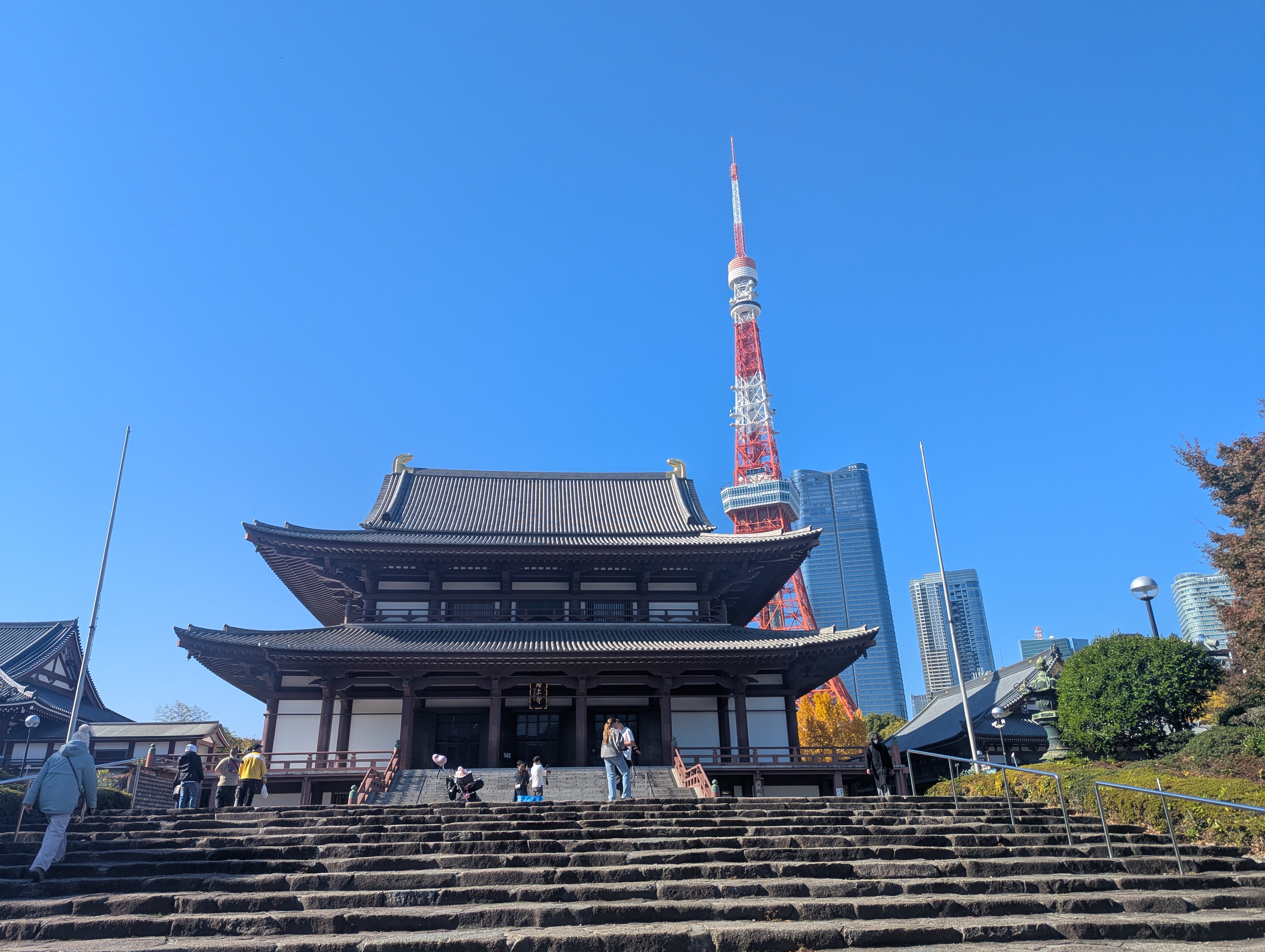 そして正面に「大殿」。室町期の阿弥陀如来像、脇に法然上人像、善導大師像がまつられている。 ここで最も象徴的なのは、伝統的な寺院建築の背後に、現代的な東京タワーがそびえ立つ景観です。江戸から続く歴史と、昭和から現代を象徴するタワーが重なり合う景色は、まさに東京を代表する絶景といえます。