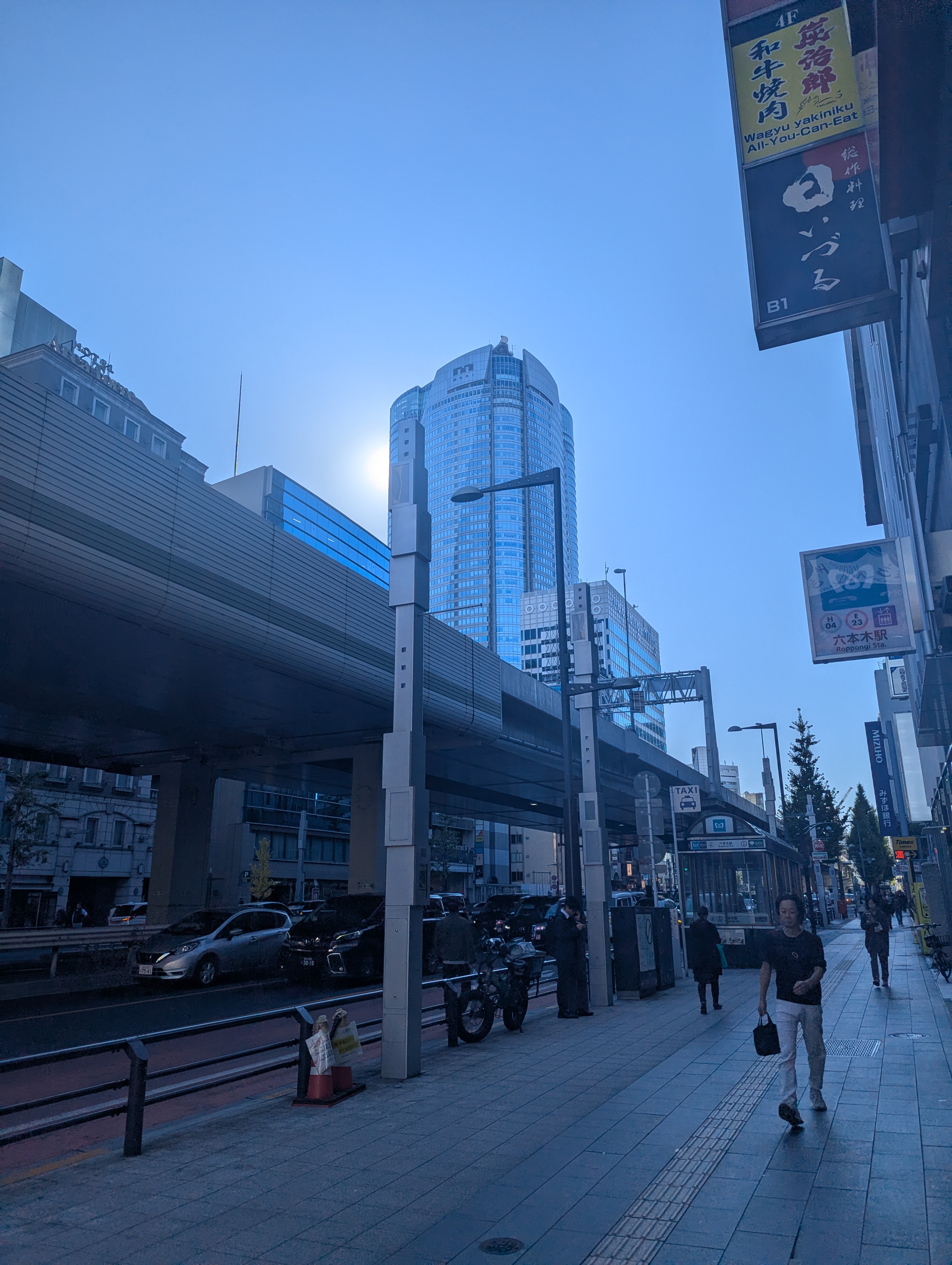 また、交差点からはちょっと見づらいが、近年の再開発の象徴ともいえる「東京ミッドタウン」と「六本木ヒルズ」を望むこともできます。