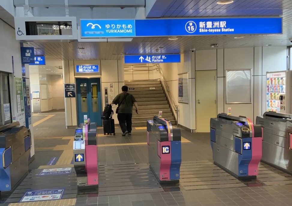 ゆりかもめ 新豊洲駅改札出口 「シュミタイム」と書かれたタオルをもってお待ちしております。
